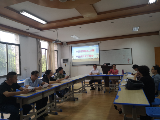 5月11日下午,外国语学院召开2021届毕业生就业工作会议。学院全体领导、毕业班班主任、教研室主任、辅导员参加会议,会议由学院党总支书记阳立新主持。
