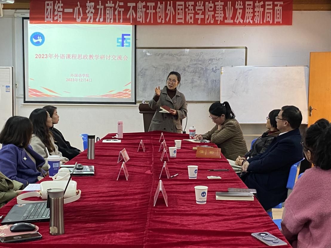 2023年12月4日下午,学院在播馨楼301举行了外语课程思政教学研讨会,院领导、各教研室主任及任课老师参加了本次会议。会议由胡瑾院长主持,阳立新书记进行了讲话,杨蔚、王菲、吴岚老师作为湖南省普通高校课程思政教学比赛外语类获奖团队代表,就如何提升外语课程思政教学水平分享了个人经验和看法。最后,胡院长做了总结发言,希望通过本次研讨会的深入讨论,引导学生把个人思想和国家命运紧密相连,让思政教育内化于心,外化于行。