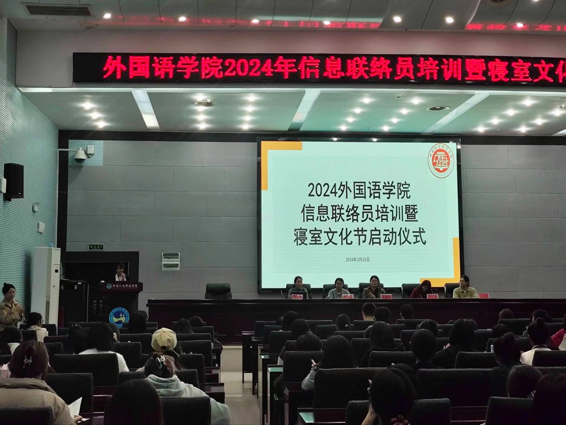 为落实学校关于加强信息联络员培训的相关精神,进一步提升信息联络员队伍能力,加强信息联络员队伍的责任心,3月26日晚7:30,外国语学院在图书馆二会议室举办2024年度信息联络员培训暨寝室文化节启动仪式,学院党总支副书记罗嗣安、全体辅导员、全体信息联络员及心理委员参加。
