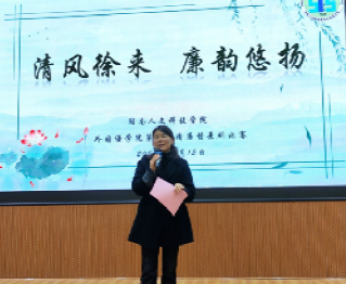 为深入贯彻落实习近平总书记关于清廉建设的指示精神,帮助师生树立正确廉洁观,努力营造学廉、思廉、崇廉、尚廉的良好氛围,有效推进清廉校园建设,2024年12月12日晚,外国语学院在匠成楼报告厅举办第二届“清风徐来 廉韵悠扬”清廉情景剧大赛。纪委副书记、监察专员办公室主任、巡查工作领导小组办公室主任江彤,外国语学院党总书记李霞、党总支副书记罗嗣安、副院长周萍,纪委监察专员办公室巡察科科长邱波蔚观看比赛并担任评委。学院全体辅导员、班主任老师、学生党员及2024级学生参加活动。