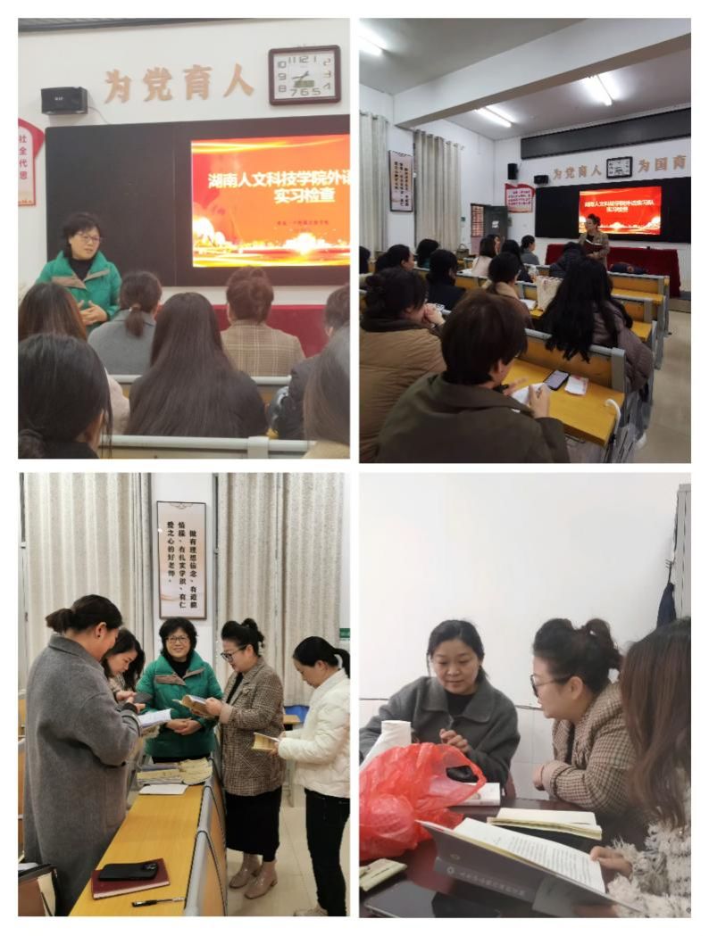 为全面了解学生实习情况,加强实习管理,提升实习质量,12月6、13日,外国语学院分别对娄底一中附属实验学校和娄底金海学校的教育实习工作进行了中期检查,张点院长、罗嗣安副书记亲自带队,成立了院办公室、学工处以及英语教研室的老师组成的检查组,确保检查工作的顺利进行。