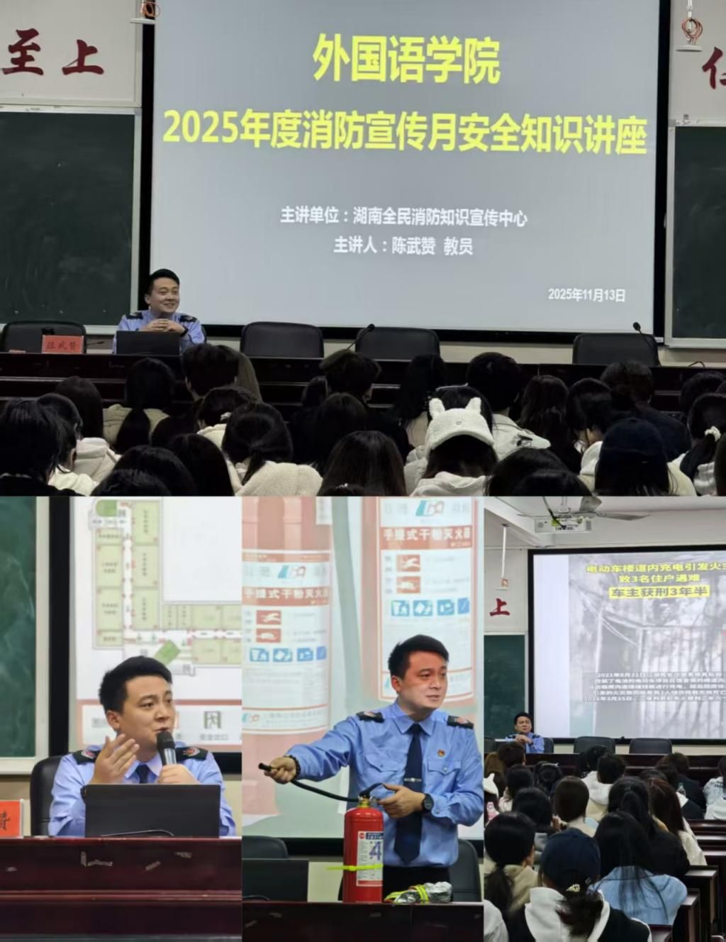 2025年11月13日晚,外国语学院组织开展2025年度消防宣传月安全知识讲座,邀请湖南全民消防知识宣传中心陈武赞教员为25级新生宣传消防安全知识,旨在强化学生消防安全意识、提升应急自救能力。
