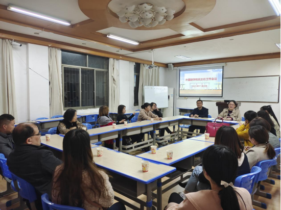 2021113日晚,外国语学院在播馨楼301召开班主任工作会议,院党总支书记阳立新、全体班主任、辅导员参加,会议由党总支副书记罗嗣安主持。