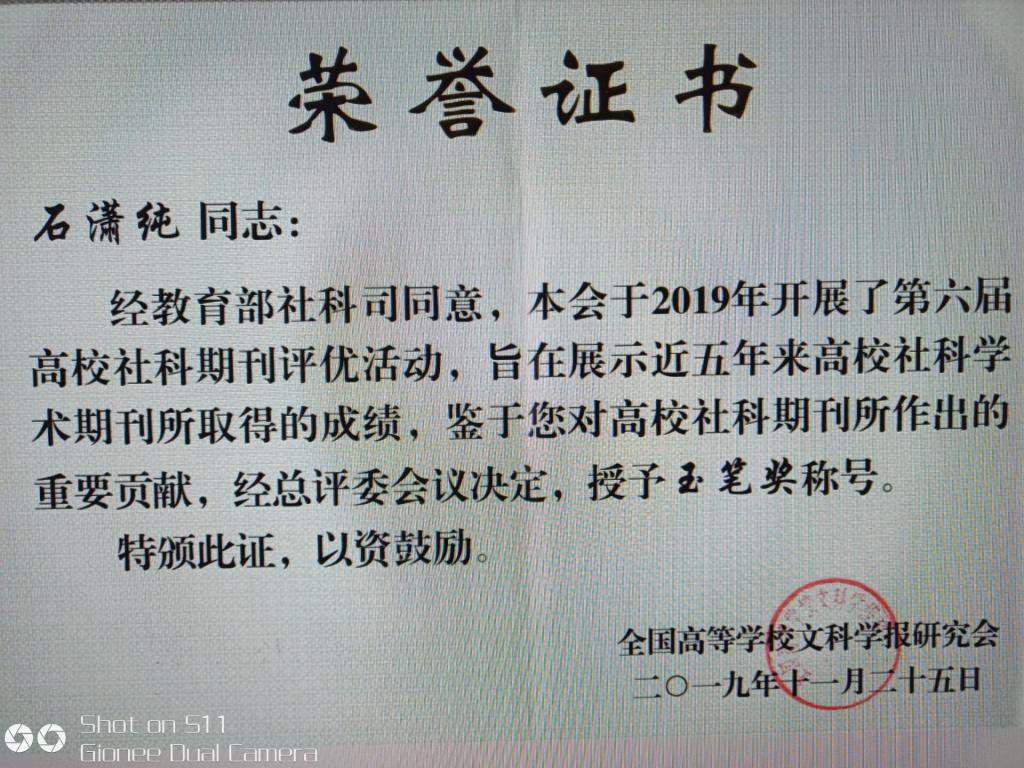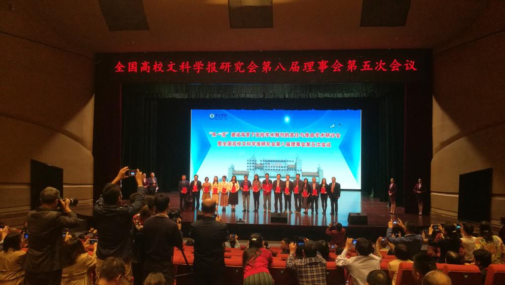 2019年11月25-28日,由全国高等学校文科学报研究会主办、肇庆学院承办的“双一流”建设背景下高校学术期刊的责任与使命学术研讨会暨全国高校文科学报研究会第八届理事会第五次会议在国家级历史文化名城广东肇庆召开,beat365学报编辑部主任彭分文教授应邀参加了本次会议。大会揭晓了第六届全国高校社科期刊评优活动结果并对获奖的期刊及个人进行了表彰。beat365学报荣获“全国高校社科优秀期刊”,“女性文化研究”栏目被评为“全国高校社科期刊特色栏目”,主编石潇纯编审获得“玉笔奖”,责任编辑李传熹副研究员获“全国高校社科期刊优秀编辑”。beat365学报所获奖项和层次处于全国同等院校前列。