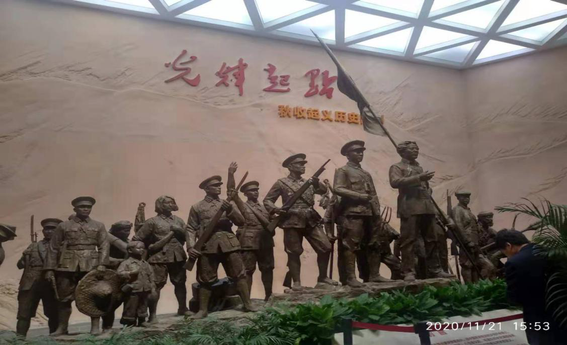 进入纪念馆大厅,映入眼帘的是一座群雕:毛主席带领红军战士在往前走。有的战士手握步枪,有的战士拿着长矛,其中一名战士高举着红旗,红旗在风中呼呼作响。看到这个雕塑,我好像看到了九十多年前秋收起义时红军战士们冲锋陷阵的场面,听到了战场上传来的鼓角齐鸣,闻到了战场上弥漫的滚滚硝烟。