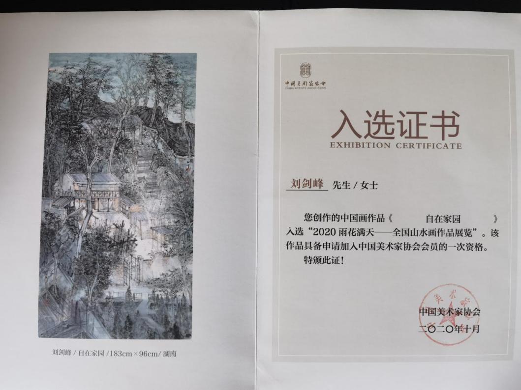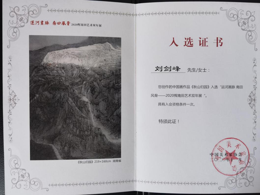刘剑峰是中国美术家协会会员(公示期),湖南省中国画学会理事,湖南省青年美协理事,娄底市美协副主席,娄星区美协主席,省十届青联委员。刘剑峰从事绘画二十余年,在追求艺术的道路上耕耘不辍,从2007年工作以来,先后获得2007年湖南省美协七家单位联合主办的首届全省“开源杯”书画大赛银奖,2009年省政协、湖南省美协主办的同舟前行书法美术摄影展铜奖,2009省文化厅主办的湖南省艺术节铜奖,第十二、十三届全国美展湖南展区优秀奖,第四届省青年美展优秀奖。近年来,他深入生活,扎根生活,紧随时代,讴歌时代,以家乡故土的人文和历史为土壤创作出了《湘中明珠》、《巍巍岳麓》、《城子古村》、《自在家园》、《故乡新梦》、《秋山归园》和《清风徐来祝融峰》等反映时代、礼赞党和人民的好作品,其作品也先后在中国美协举办的全国画展中频频入选并获奖,其中作品《秋山归园》入选2020年全国恽南田艺术双年展并荣获入会资格(本次活动最高奖项),作品《自在家园》入选2020年雨花满天全国中国画展并荣获入会资格奖(本次活动最高奖项),作品《清风徐来祝融峰》入选2021年首届南岳衡山全国中国画展,作品《高山仰止》入选“子愷故里,美丽桐乡”全国中国画展。