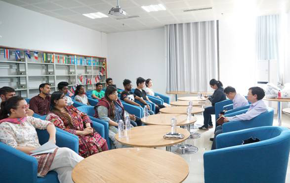 4月25日上午,党委委员、副校长陈志国来到学校中外文化交流中心,看望了刚上完《汉语综合课程》的2019级留学生,并与他们进行了亲切座谈。