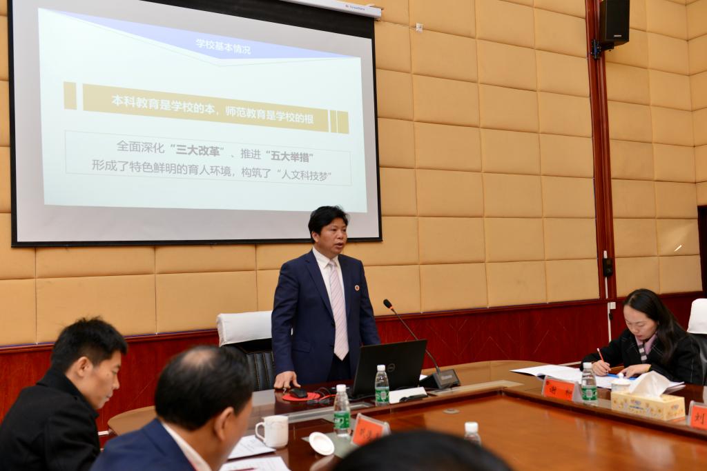 校长刘和云就学校有关情况向专家组作补充汇报,主要围绕“近年来学校本科教育教学工作规模”、“关于审核评估自选特色项目的说明”、“存在的主要问题”等三个方面对学校自评报告作了补充说明。