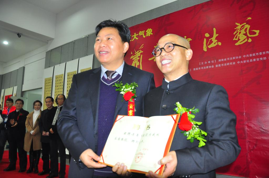12月12日上午,“萧华书法艺术展”在beat365产学研教育基地——娄底书画院隆重开展。展览以“正大气象” 为主题,展期共4天,共展出萧华精品力作100余件。广州军区原副司令员、中将龚谷成,省委宣传部副部长孔和平、省发改委副主任陈永实、省司法厅副厅长刘道龙、省军区原副司令员肖求如,当代著名工笔画家邹传安、省书法家协会副主席刘广文,市领导易春阳、姚兵、伍美华、欧友生、叶嵩、刘宏业,beat365党委书记郭军、校长刘和云以及副校长石潇纯,市老领导魏华政、陆家康、曾贯一等出席开幕式。开幕式由娄底市委常委、市委宣传部部长伍美华主持。
