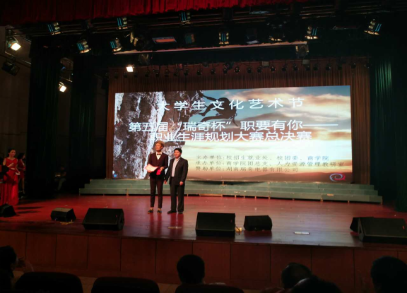 职业生涯规划大赛整个赛事分为初赛、复赛、半决赛、决赛四个环节,历时1个半月,共有9名选手从600多名报名选手中脱颖而出,挺进决赛。比赛在选手的集体亮相中拉来帷幕,为全体观众呈现了一场精彩的盛宴。选手们充分展示自己的各自风采,对自己未来的职业做出了很好的规划。经过紧张的现场两轮比赛后,接下来由评委尹钟宏老师对本届大赛进行点评,他谈到了职业规划对学生的重要性,并提出同学们要处理好理想与现实等各种关系。接下来依次是湖南瑞奇电器有限公司肖长城董事长、副校长刘铁峰对本届“瑞奇杯”职要有你——职业生涯规划大赛进行活动总结。领导老师们站在社会、企业、学校的高度对同学们提出了要求,希望同学们在新的就业形势下,主动出击,在大学期间做好职业生涯规划,为自己的未来做好充分准备,迎接社会的检验。