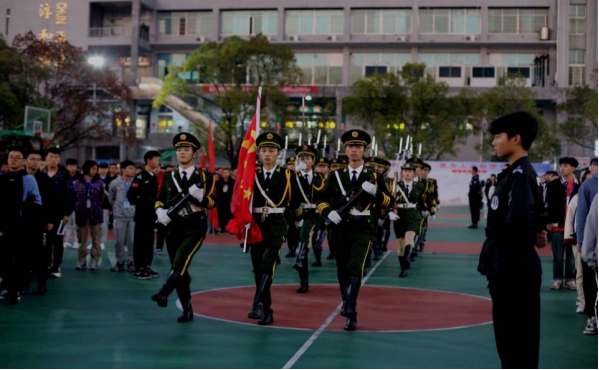 6:30分,升旗仪式正式开始,国旗护卫队队员们踏着坚定有力的步伐,护送五星国旗入场,全体师生行注目礼,在庄严的国歌声中,五星红旗冉冉升起。