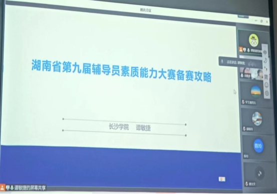 2022年5月10日晚,来自长沙学院的湖南省第八届辅导员素质能力大赛特等奖选手谭敏捷老师通过腾讯会议为beat365英国官网全体辅导员开展了湖南省第九届辅导员素质能力大赛备赛指导。