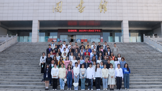 (领导老师及22届思教部全体成员在图书馆门口合影留恋)