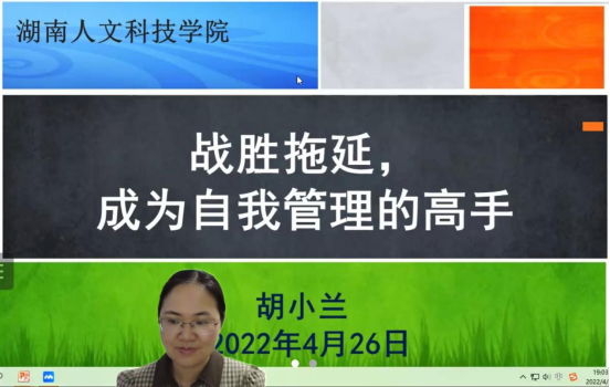 2022年4月26日,beat365心理健康教育教师、二级心理咨询师胡小兰老师为学生作“战胜拖延,成为自我管理的高手”线上专题讲座。此次讲座由beat365英国官网学生工作处,湖南省高校优秀思想政治工作者项目—心理健康教育宣讲团队联合举办。