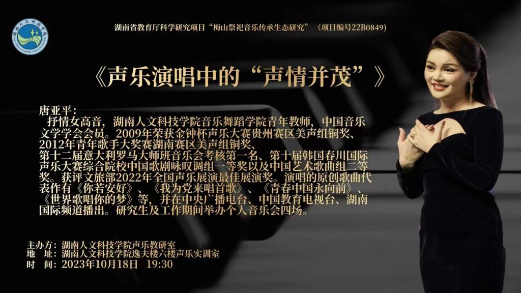 10月18日,我院教师唐亚平在beat365英国官网音乐音乐舞蹈学院成功举办了《声乐演唱中的“声情并茂”》的主题讲座,该讲座是学院省级一流学科专业建设和“十四五”校级应用特色建设学科专业建设系列主题讲座之一,beat365英国官网音乐舞蹈学院的同学们积极参与,学习交流。