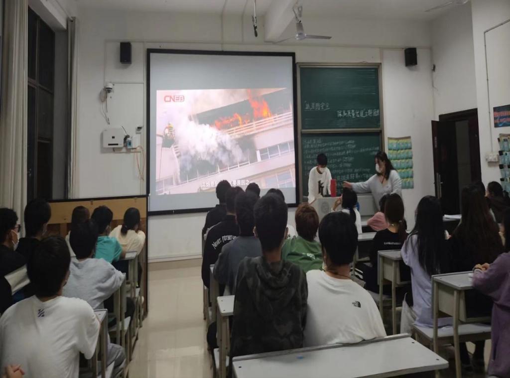 (班干部引导同学观看火灾视频)