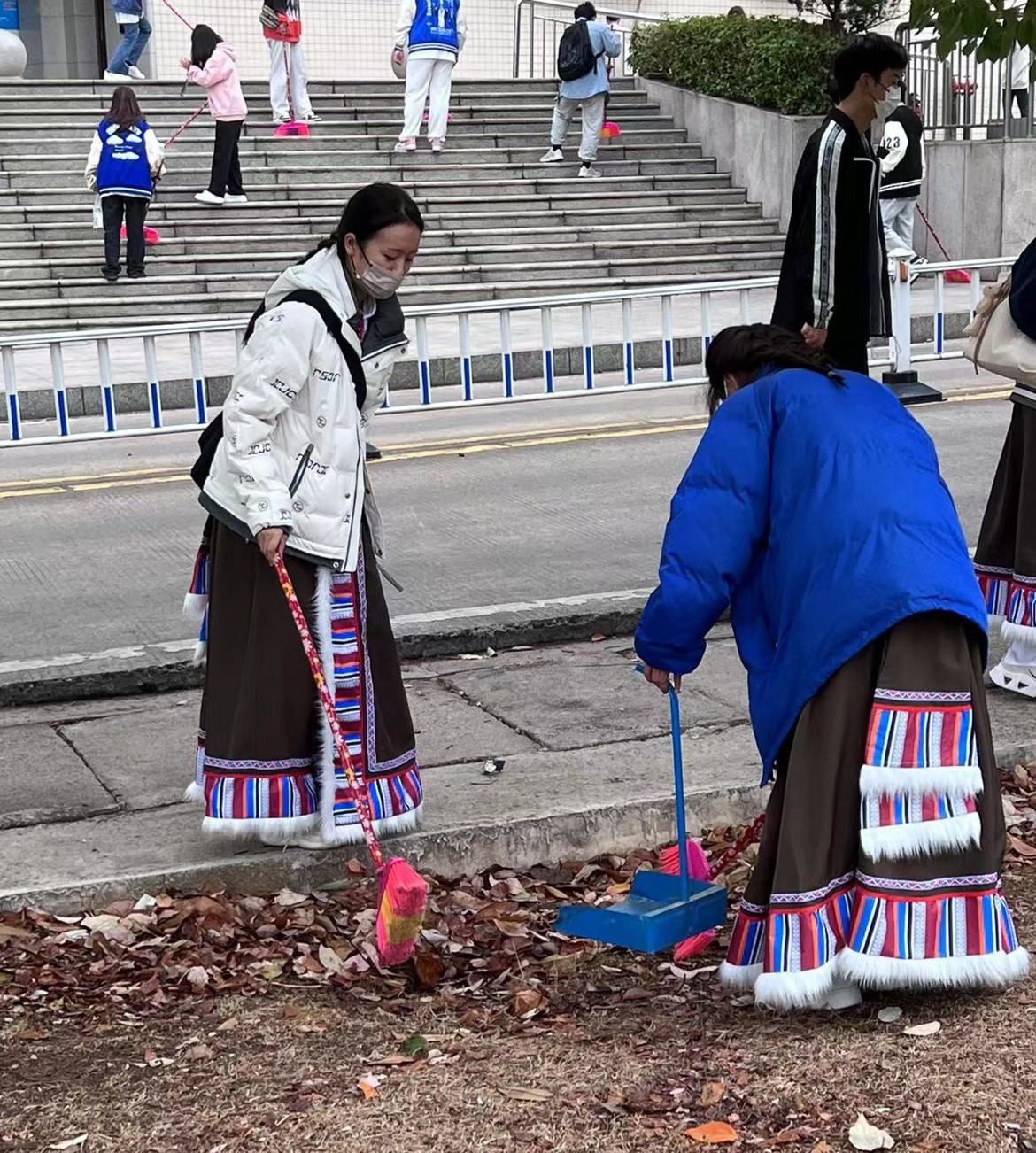音乐舞蹈学院的同学们保持着高涨的热情,脸上洋溢着笑容进入了分配的打扫区域:有同学拿起耙子迅速地将枯枝败叶从草丛中耙出;有的同学弯下身躯,捡起绿地上的白色垃圾;还有的同学走向高处的花田,用手认真地捡起其他零碎的垃圾。大家仔仔细细地清扫每一个地方,不放过任何一片垃圾,呵护人文整洁的校园环境。