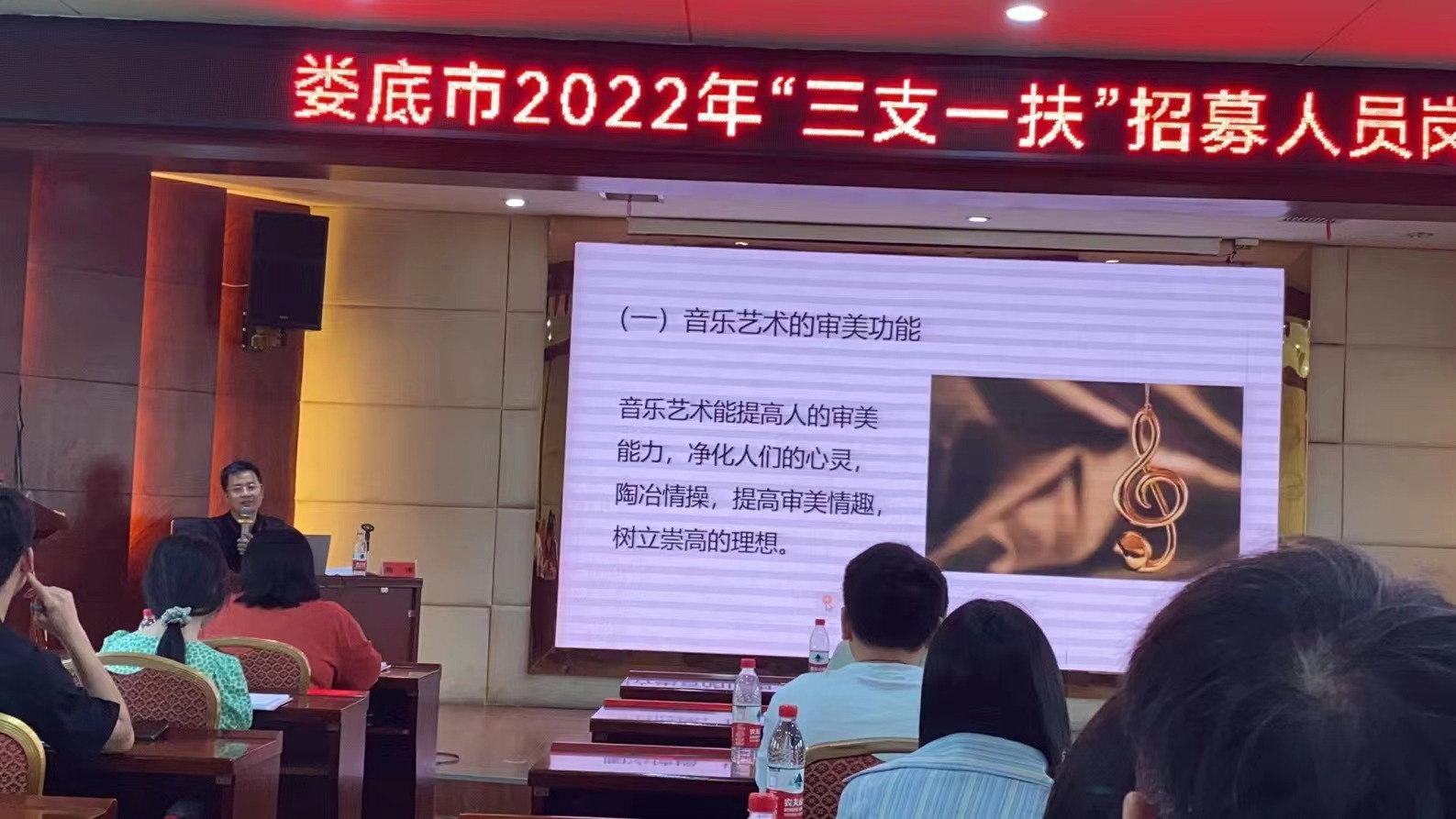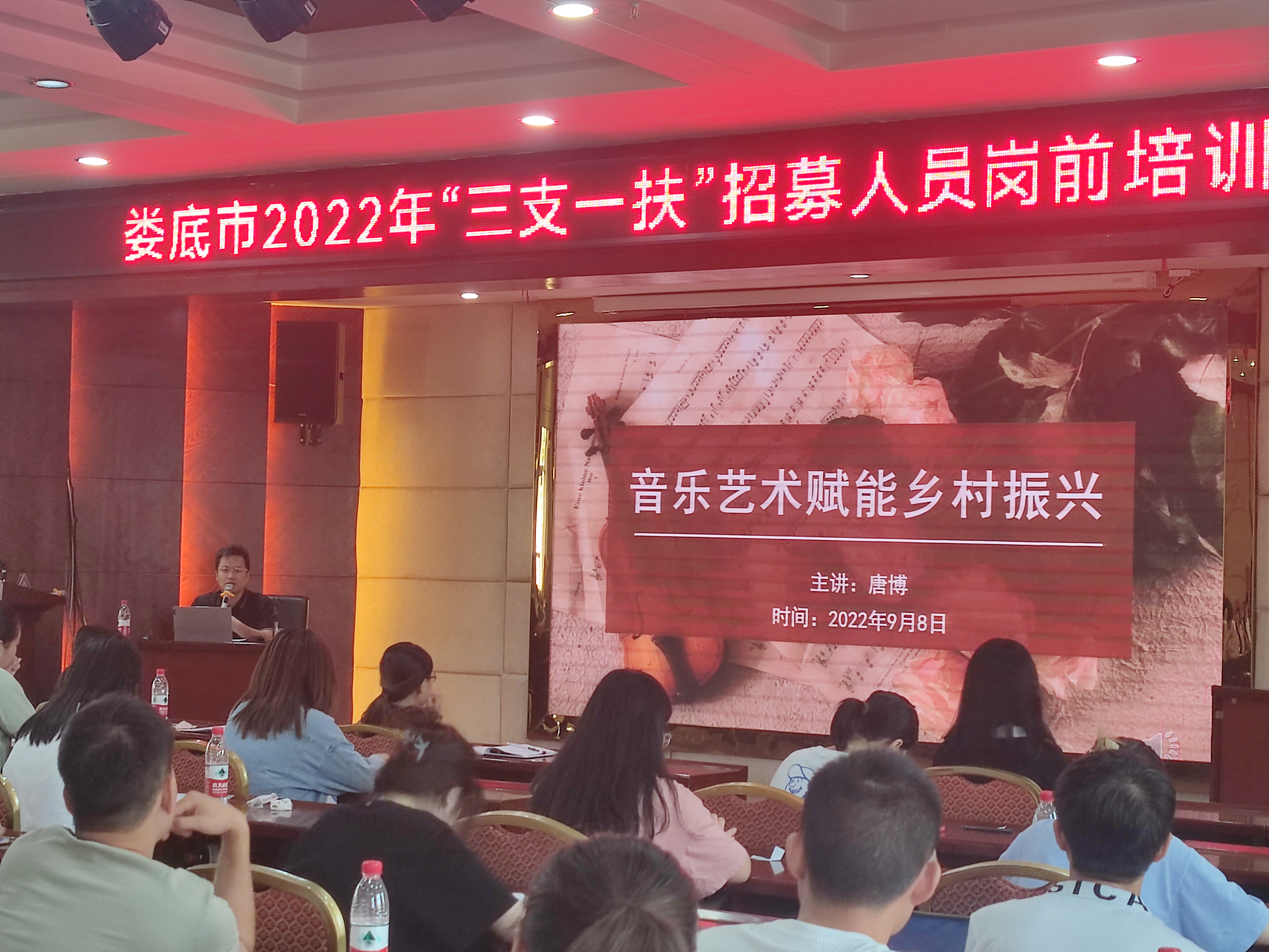 9月8日上午,我院唐博副教授应娄底市国家公务员培训中心的邀请,为娄底市2022年“三支一扶”招募人员岗前培训做《音乐艺术赋能乡村振兴》专题讲座。本场讲座,唐博老师从乡村振兴战略的提出与实施、乡村振兴与乡村文化振兴、乡村音乐艺术基础知识、乡村音乐艺术中的情感表达、乡村音乐艺术的社会功能、音乐艺术赋能乡村振兴策略六个方面进行讲解。长达两个小时的讲座,唐博老师首先解读了国家乡村振兴战略、文化自信和乡村文化振兴的相关文件和政策。期间,唐博老师从乡村音乐艺术的角度结合乡村文化振兴,向全体学员详细讲解了乡村音乐艺术铸魂凝神、以文化人、价值引领、滋养乡情的作用;通过赏析与案例结合的方式,向学员们讲解了乡村音乐艺术在乡村振兴中的审美功能、认识功能、教化功能和娱乐功能。最后,唐博老师从音乐艺术助推乡村精神文化建设、音乐艺术助力乡村特色产业升级、音乐艺术赋能乡村素质全面提高三个方面,对音乐艺术赋能乡村振兴策略进行了讲解。