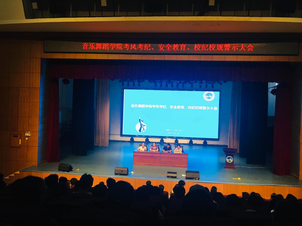 2021年6月25日晚20:00,音乐舞蹈学院召开考风考纪、安全教育、校纪校规警示大会。院长周邦春、书记刘纲华、副书记邓莉立、副院长刘利连、全体辅导员、班主任以及全院在校学生参加,会议由刘纲华书记主持。