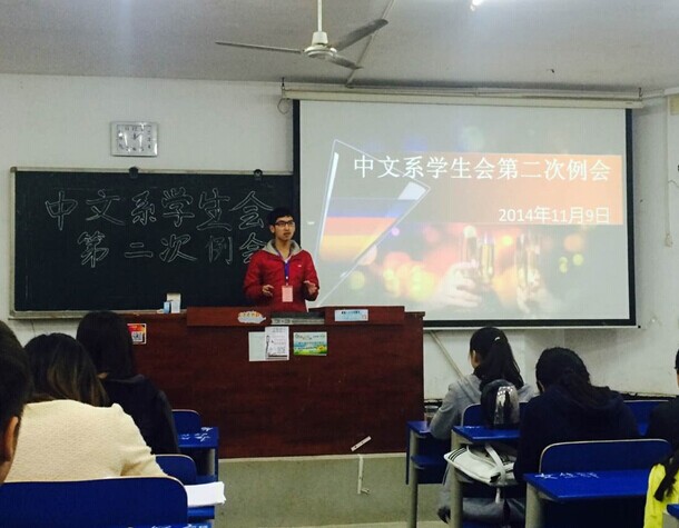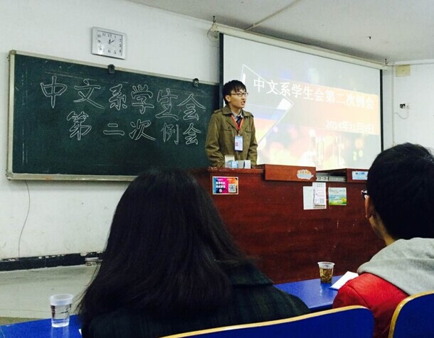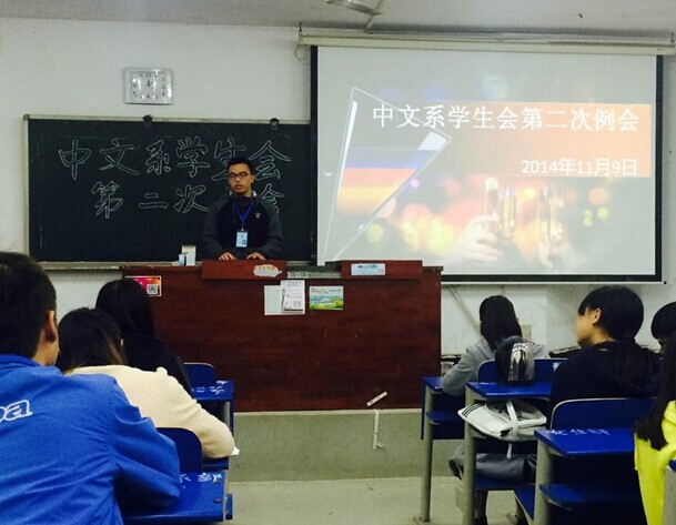 2014年11月9日晚18:00,中文系学生会第二次全体大会于致远楼220教室成功召开。主席孙阳、主席助理及各部门部长出席了本次大会,中文系学生会14级全体干事参加了此次会议,大会由心理部干事蒋谦主持。